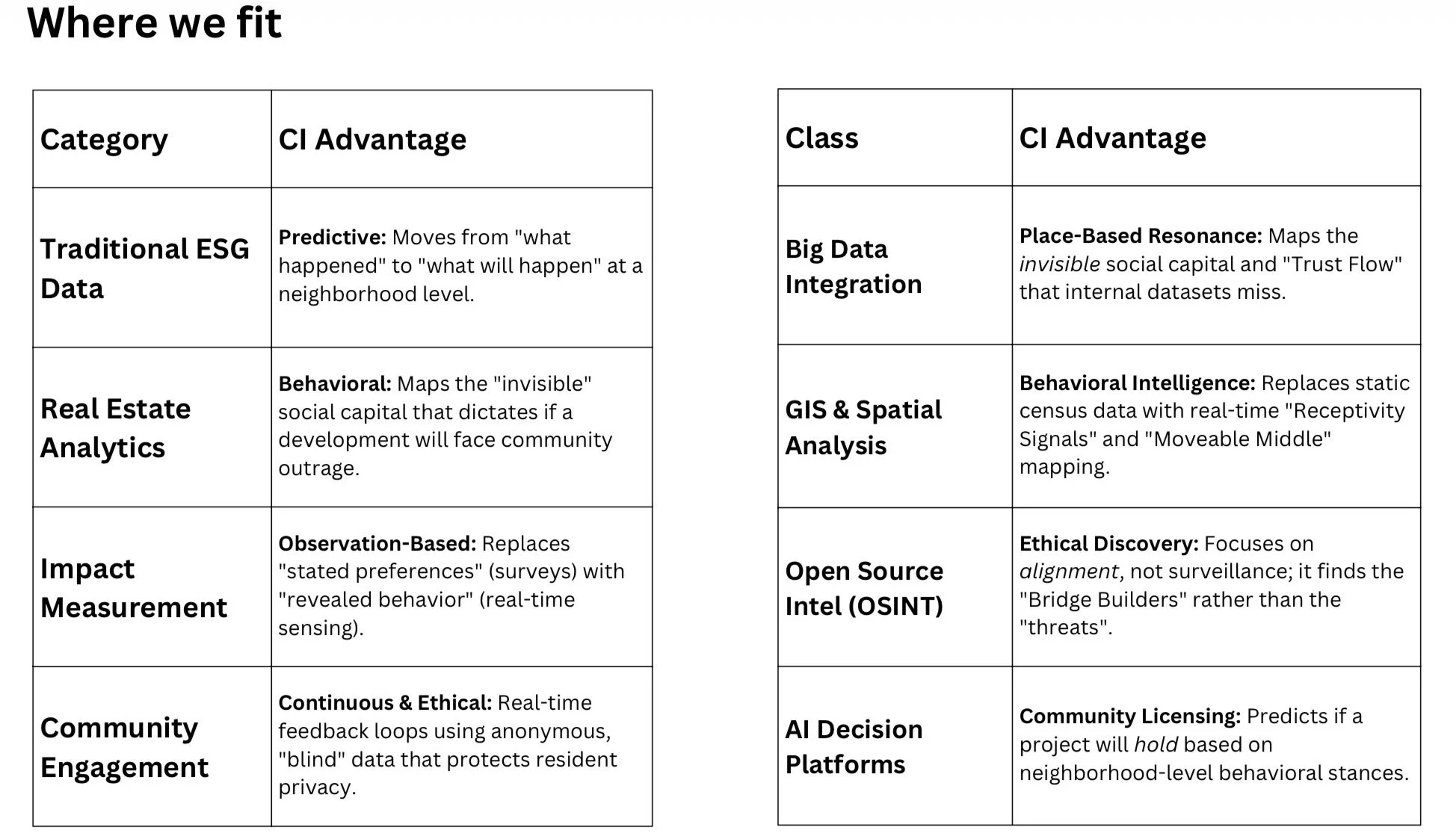 “Decision grade diagnostic, community, and portfolio services. Standing risk management layer for all community-facing capital. E.g. Precision Sensing: Replace 6-month-old surveys with 174 real-time behavioral indicators for an "Always-On" social risk assessment. Timeline Compression: Prove community alignment before co-financing, save months of "proposal-outrage" delays > massive $M ROI in knowing where development works --before breaking ground. PS: Ensuring a durable "Ethical Foundation" for ESG reporting (GRESB/MSCI)”