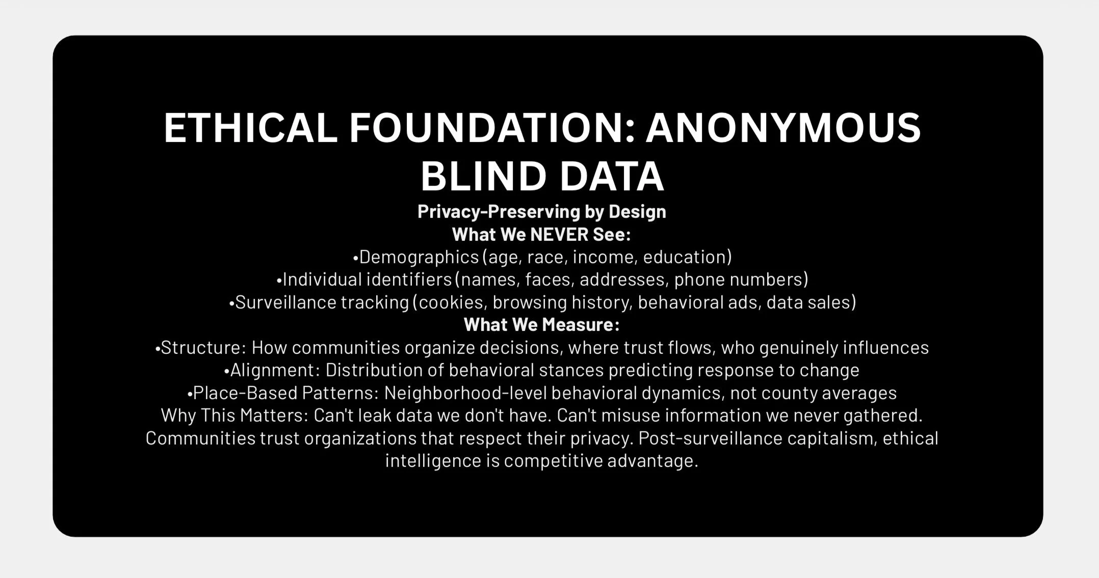 Our methodology includes proprietary frameworks for measuring community behavior representing decades of research and investment. These systems predict how communities form decisions, build trust, and respond to change with accuracy that traditional analytics cannot achieve.