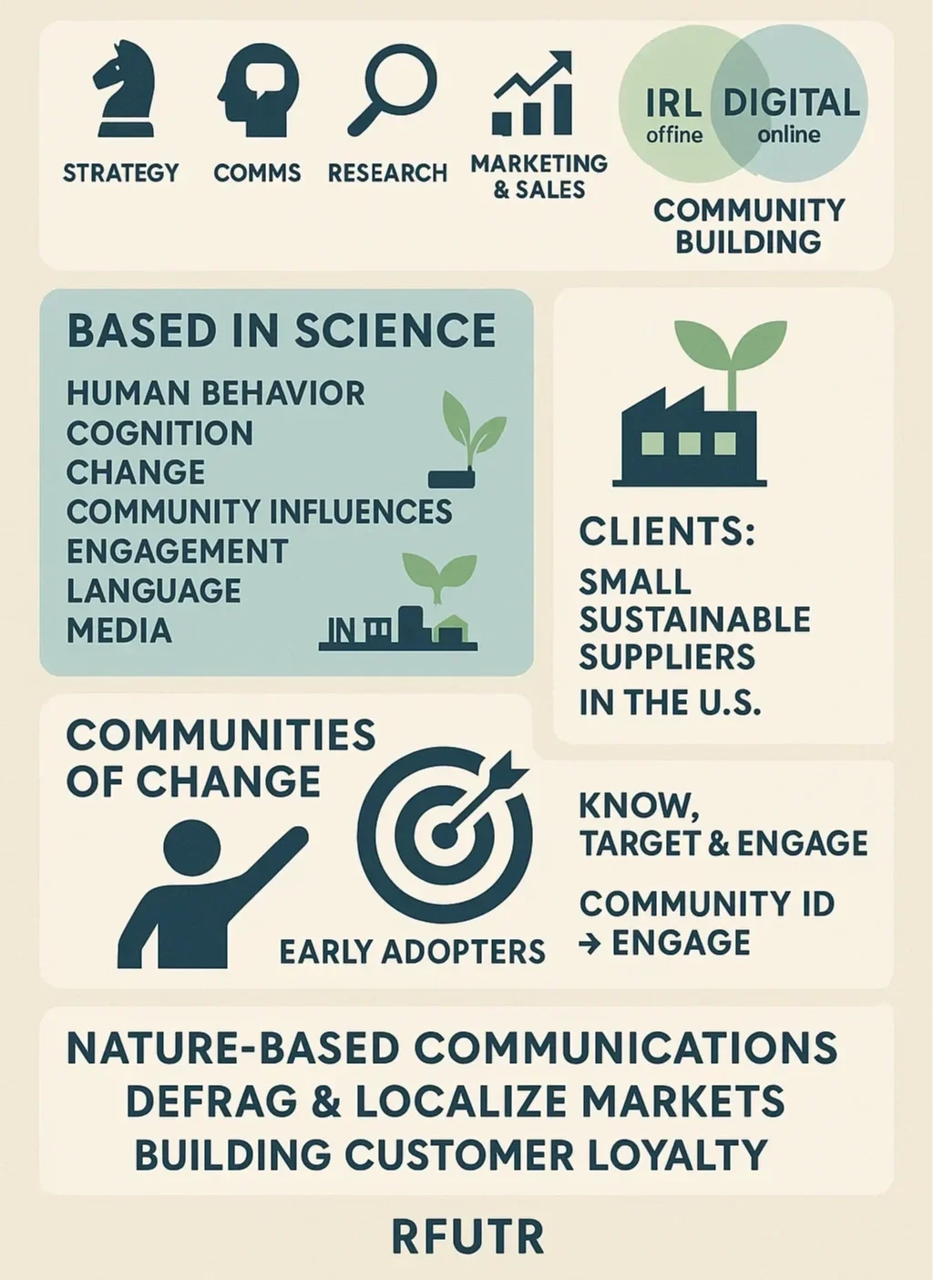 De-fragmentation Connecting scattered consumers with aligned businesses Neuro-Marketing Cognitive science to create messaging to resonate with values Behavior Change Research Projects Incentives Lab Market test nature based benefits and triggers Community Intelligence Understand cellular level cultural coherence Hyper-local Partnership Building Place-Based Activation Local Market Development